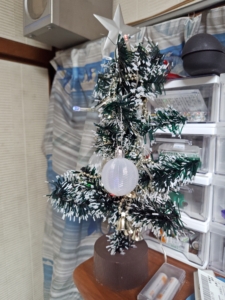 数年前ダイソーで購入したクリスマスツリーにLEDと飾り物を加えたもの